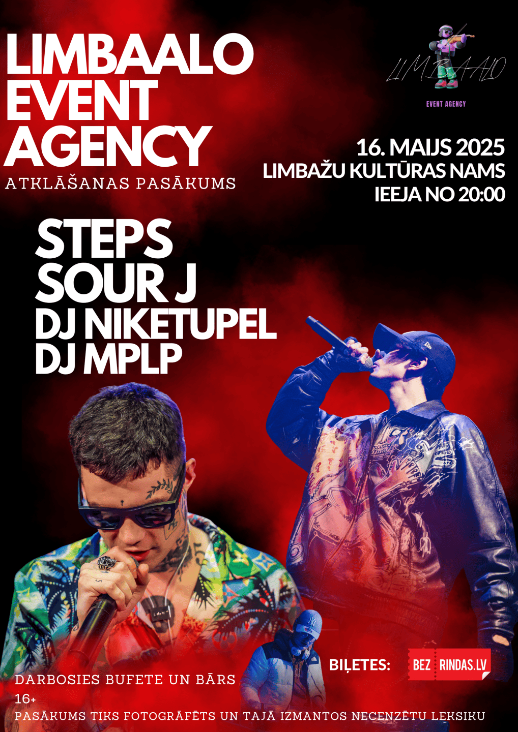 Straujiem soļiem tuvojās reperu vasara un pirmie džona malki aizvedīs uz Limbažu kultūras namu, kur 16. maijā notiks pasākumu aģentūras LIMBAALO atklāšana kopā ar STEPU no Mauzoleju mūzikas un Banda Banda, kā arī skābāko no skābajiem SOUR J. Iesildīs pašmāju DJ MPLP un DJ NIKETUPEL! Parūpēsimies par labu atmosfēru kopā!