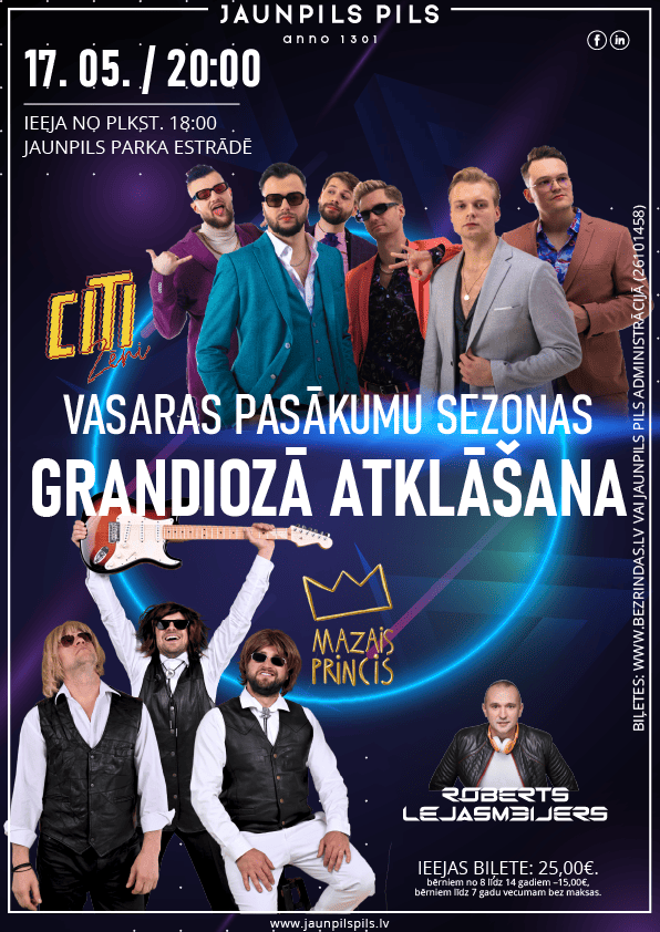17.maijā plkst. 20:00 Jaunpils parka estrādē notiks iespaidīga vasaras sezonas atklāšanas koncerts. Uz skatuves kāps divas enerģiskas Latvijā iemīļotas grupas – "Citi Zēni" un "Mazais Princis" ar pārsteiguma viesi, pēc koncerta afterparty kopā ar DJ Roberts Lejasmeijers.