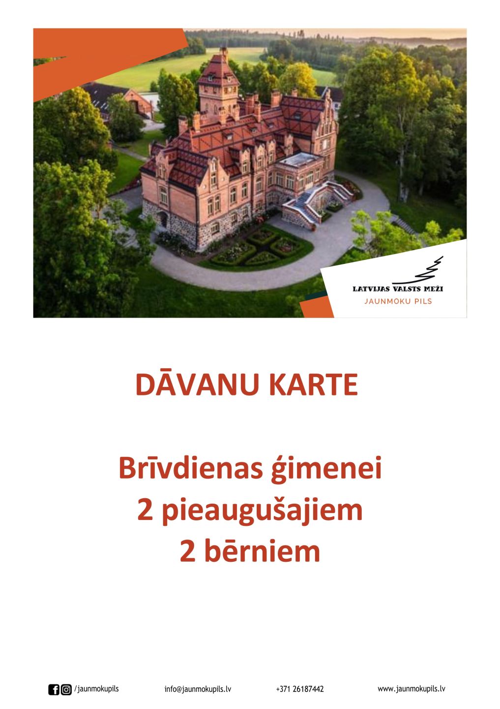 Lieliska dāvana ģimenei – aktīva, interesanta un izzinoša atpūta Jaunmoku pils kompleksā. Ģimene pavadīs relaksētu laiku Dīķa mājas ģimenes numurā, kas iekārtots ērti un mājīgi, ar virtuves stūrīti, TV, dušu un WC. Piedāvājumā arī Jaunmoku pils muzeja apmeklējums pils dāmas pavadībā, kurā varēsiet aplūkot Meža muzeja izglītojošo ekspozīciju un uzkāpt 20 m augstajā tornī, lai apbrīnotu apkārtni un Kurzemes pakalnus raugoties no putna lidojuma skata punkta. Ģimenes piedzīvojums turpināsies izlaušanās spēlē "Zaļā meža melnie stāsti“, kur būs jārisina uzdevumi, lai izglābtu meža iemītniekus. Lai pilnībā izbaudītu dabu un iepazītu Jaunmoku pils apkārtni, dosieties aizraujošā orientēšanās spēlē. Kā nostiprināt šeit gūtos iespaidus, lai tie paliktu atmiņā uz ilgu laiku? Izkalsiet Laimes monētiņu, kas visu labo vairo dubultā.