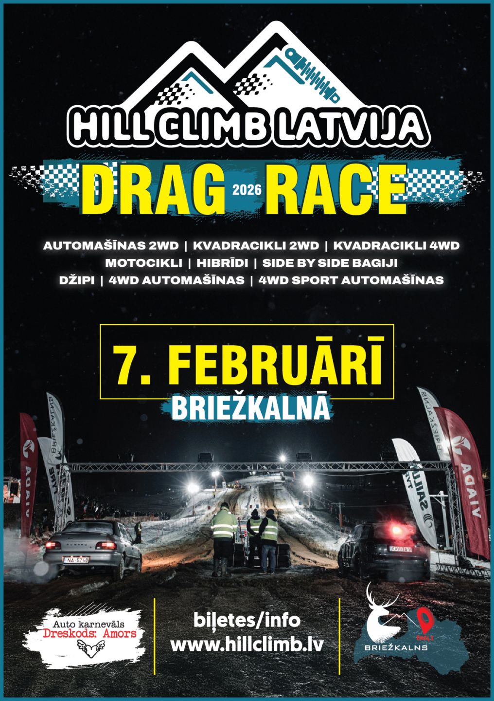 Sniegs, jaudīgu motoru rūkoņa, ledus, sīvas cīņas, adrenalīns un skatītāju ovācijas! Šis ir vienīgais un trakākais auto-moto pasākums Latvijā, kur kalnā braukšana kļūst par īstu piedzīvojumu. Šogad turpināsim iepriekš iesākto disciplīnu DRAG RACE! Jā, Drag Race atgriežas slēpošanas trasē!