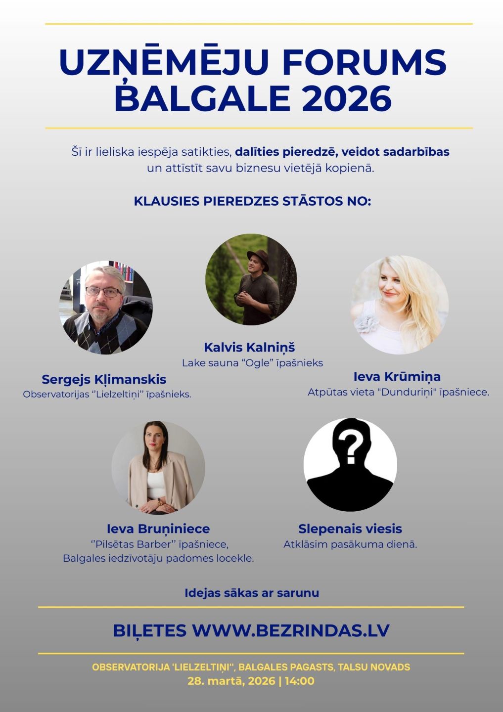 Ja tu radi, ražo, saimnieko vai domā par savu uzņēmējdarbību nāc un pievienojies pirmajam uzņēmēju forumam Balgale 2026! Satiec līdzīgi domājošus cilvēkus, veido jaunus kontaktus, lai kopā radītu iespējas mūsu reģiona attīstībai. Idejas sākas ar sarunu.