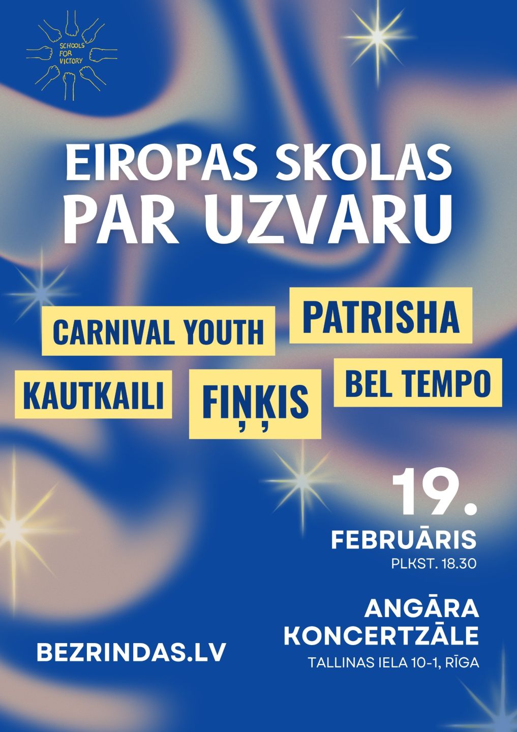 19. februārī Rīgā, Angāra koncertzālē, Tallinas ielā 10-1, no plkst. 18.30 notiks biedrības "Tavi draugi" iniciatīvas "Skolas par uzvaru" labdarības koncerts Ukrainas atbalstam. Tajā uzstāsies Carnival Youth, Fiņķis, Patriša, Kautkaili un Bel Tempo.