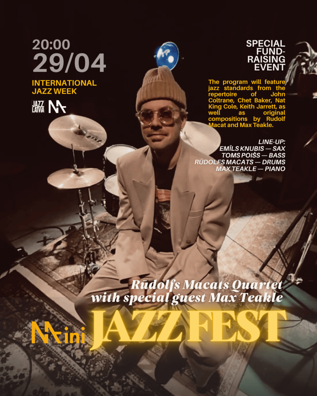 Вечер, который состоится накануне Международного дня джаза, объединит музыкантов, познакомившихся на джеме в MASA и продолживших музыкальный диалог. В программе прозвучат джазовые стандарты из репертуара Джона Колтрейна, Чета Бейкера, Нэта Кинга Коула, Кита Джарретта, а также оригинальные композиции Рудольфа Макатса и Макса Тикла.